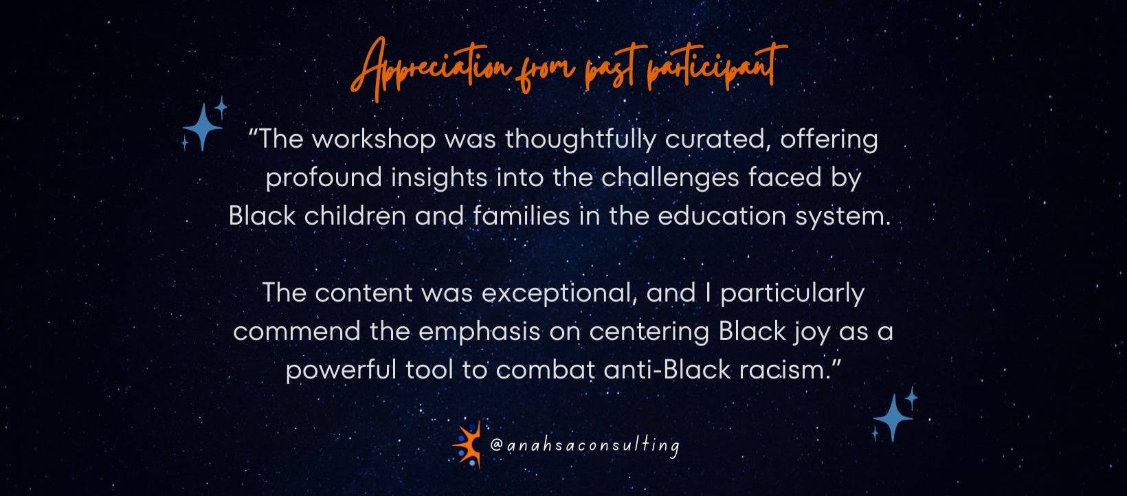 Hi friends of Anahsa Consulting, We are very excited to announce that registration is now open for the Journey to Nia 2023 Summer Retreat. This retreat is designed for early childhood educators and leaders who understand the urgency of dismantling anti-Blackness in preschool environments, which is the very force that fuels the preschool-to-prison pipeline targeting Black children. Without a clear understanding of the ways anti-Black racism shows up in the classroom, in our interactions, in...